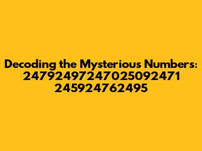 Hey guys! Ever stumble upon a sequence of numbers that just screams mystery? Well, today, we're diving deep into just that – a perplexing string of digits: 24792497247025092471 245924762495. Now, I know what you're thinking: “What in the world are these numbers and what do they even mean?” Don’t worry; we’re going to untangle this numerical knot together. This article will be your guide, breaking down the potential origins, meanings, and everything in between. So, buckle up; because we're about to go on an adventure to decode this series of numbers! The initial glance might seem a bit overwhelming, kind of like staring at a really complex equation. But trust me, we'll break it down piece by piece. First up, why should we even care about these numbers? Well, every number sequence has a story. They might be a code, represent dates, or point to something hidden. You never know until you start exploring. It’s like embarking on a treasure hunt but instead of a map, you have these numbers as your starting point. Our goal is simple – to dig deep and discover what secrets these numbers might be hiding. Along the way, we'll look at different ways to approach this type of problem, from simple analysis to more complex methods. Think of it as a fun puzzle that we solve together. We will start by breaking down the number to see if there is any hidden meaning. It could be dates, a code, or even something completely different. Are you ready? Let's dive in and see what we can find.